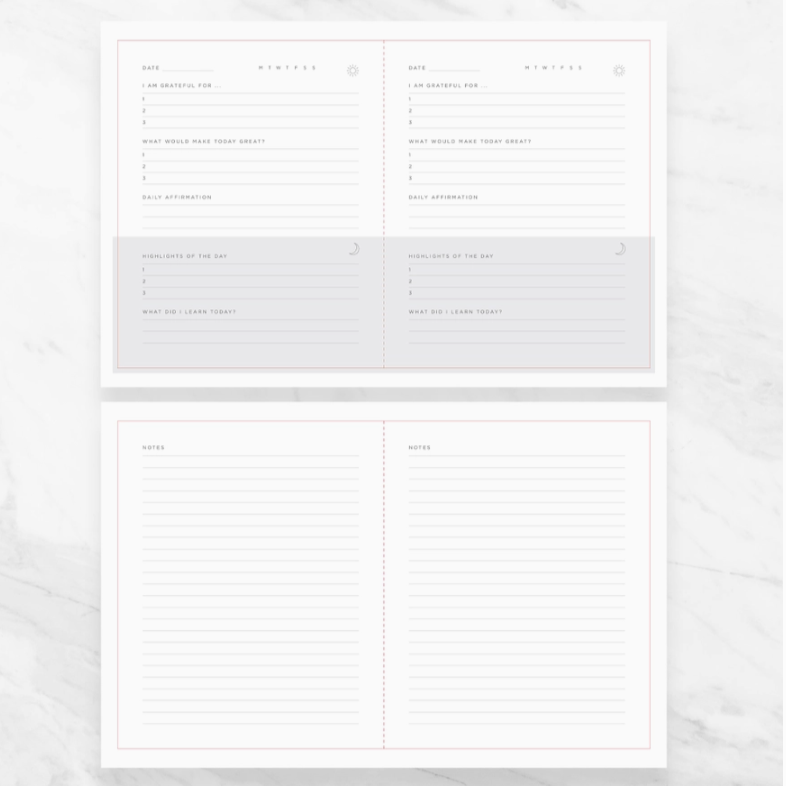 Discover the power of mindful reflection with the Five Minute Journal. This innovative journal is designed to help you create meaningful moments in your day by easily journaling your experiences. Each entry begins with thoughtfully crafted prompts like what made your day great, what you are grateful for, and an affirmation. There's also room to write down your daily highlights and lessons learned, so you can savour each moment and grow from it. Elevate your self-care routine and start your day with mindful reflection.