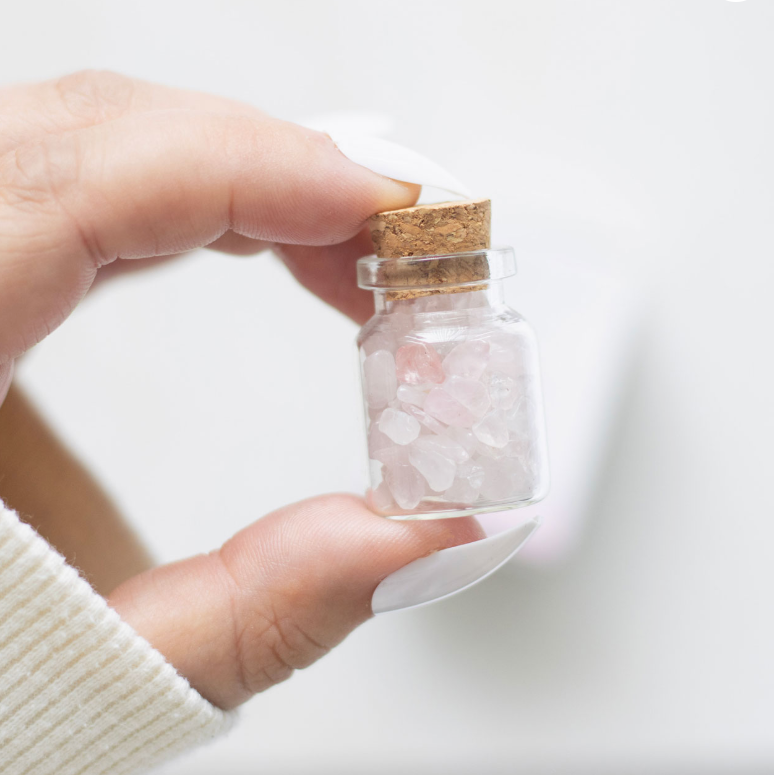 This pocket-sized Jar of Love holds rose quartz crystal chips, known for their spiritual properties of promoting unconditional love and healthy relationships. Nestled in a matching matchbox, this lucky jar makes a charming gift that brings a touch of earthy energy and care to its owner's personal life.