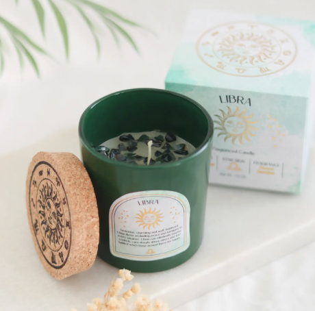 Bring power and positivity to individuals born between September 23 and October 22 with this stunning Libra zodiac candle. A sweet Jasmine fragrance is accented by a sprinkling of bloodstone chips that can later be reused for a multitude of spiritual purposes.