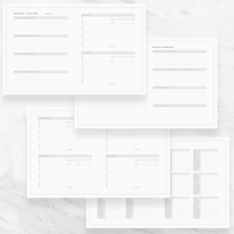 Enhance your wellbeing with this exclusive wellness planner. Track your weekly progress with food, exercise, water, and sleep goals, then enjoy the summary of your accomplishments and notes on how you're feeling. Celebrate your non-scale victories and document your challenges, all while giving yourself the luxury treatment you deserve.